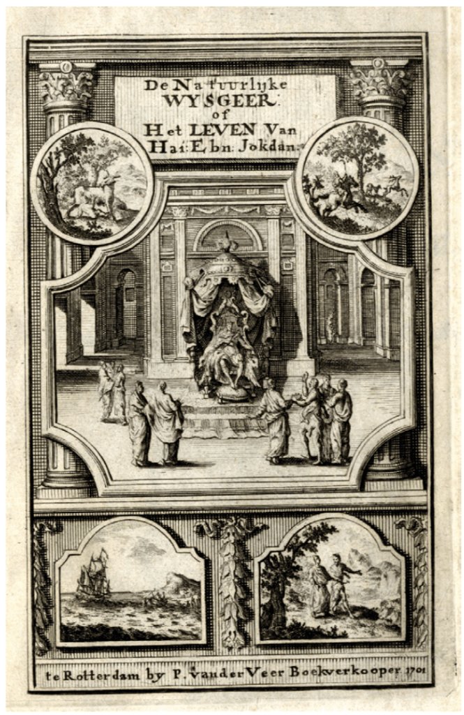 Frontispiece of De natuurlyke wysgeer, of het Leven van Hai ebn Jokdan, Rotterdam, by Pieter Van der Veer, 1701, Courtesy Leiden University Libraries, 841 F 23 source / واجهة الكتاب (حي إبن يقظان)، روتردام، بقلم بيتر فان دير فير، 1701، بإذن من مكتبات جامعة ليدن، 841 ف 23 المصدر