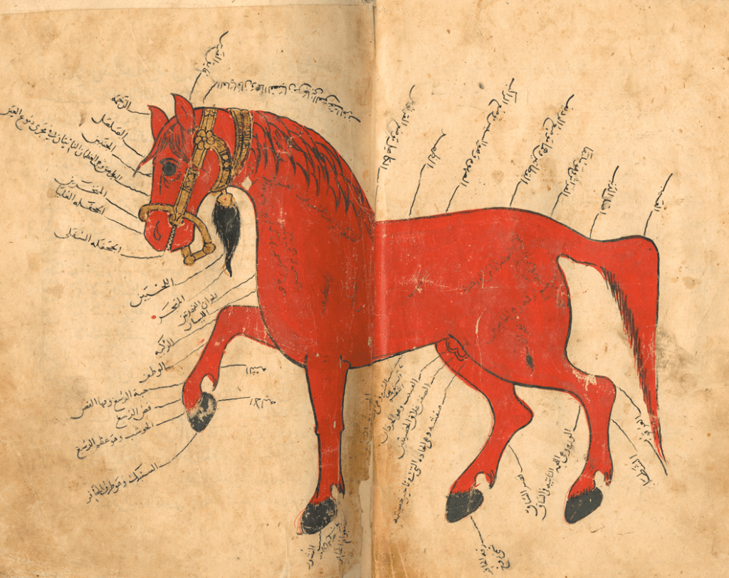 Muhammad b. Ya’ub al-Khuttuli: Horse anatomy, 1343. It was acquired by Warner and is part of the collection of the University of Leiden: source / محمد ب. يعقوب الختولي: تشريح الخيل، 1343 وقد حصل عليه وارنر وهو جزء من مجموعة جامعة لايدن: المصدر