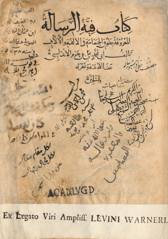 Ring of the Dove (Ṭawq al-ḥamāma fī ‘al-ulfa wa-al-ullīf) by Ibn Hazm, work written around 1022 CE in Játiva, south of Valencia. This manuscript was copied in 1338 most probably in Syria or Egypt. Manuscript since 17th century in Leiden University Library, The Netherlands. Or.927, fol.1a. Ex libris Levinus Warner (“Ex legato viri ampliss. Levini Warneri”): source / طوق الحمامة في الألفة والليف لابن حزم، كُتب حوالي عام ١٠٢٢ ميلادي في ياطيفا، جنوب فالنسيا. نُسخت هذه المخطوطة عام ١٣٣٨، على الأرجح في سوريا أو مصر. مخطوطة تعود إلى القرن السابع عشر في مكتبة جامعة لايدن، هولندا. تاريخها: ٩٢٧، الصفحة ١أ. من مكتبة ليفينوس وارنر (“إكس ليغاتو فيري أمبليس. ليفيني وارنر”): المصدر /